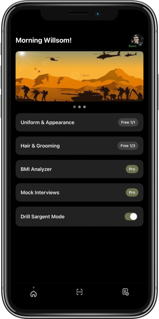 A standout feature is the Professional Boards Interview & Evaluation section. Just set your phone at a distance and let the app simulate a full board’s experience, coaching you through questions and posture. And for a bit of motivation or fun, you can activate the Drill Sergeant mode, where a virtual sergeant will bark out orders to keep you sharp!